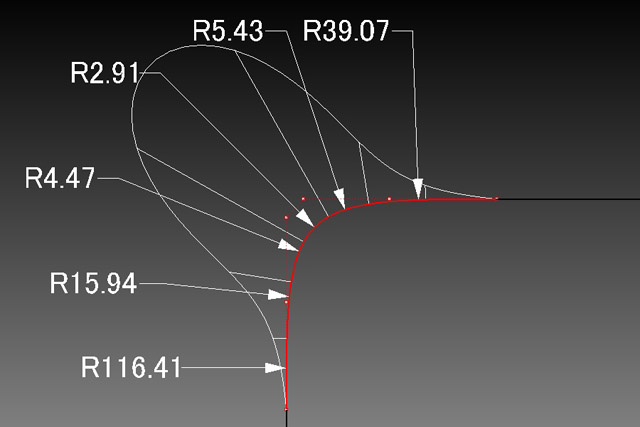Fig-45は、アプローチRとフィレットに曲率を表示した状態ではある。ここでは直線から段階的に曲率が変わっていることが分かる。