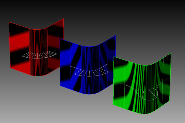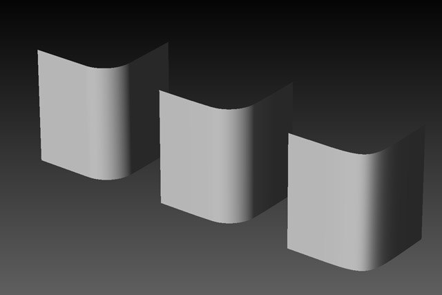 Fig-48は実際に以上の3つのカーブを単にZ方向に押し出して形状をシェーディング表示したものである。左から“フィレットと直線で作成した例”“アプローチRとフィレットで作成した例”“ぼかし部分を自由曲線で定義した例”である。