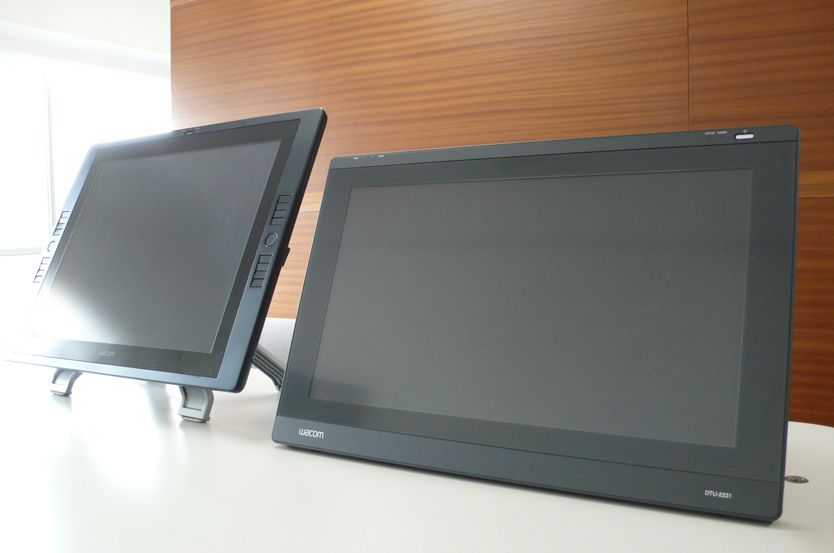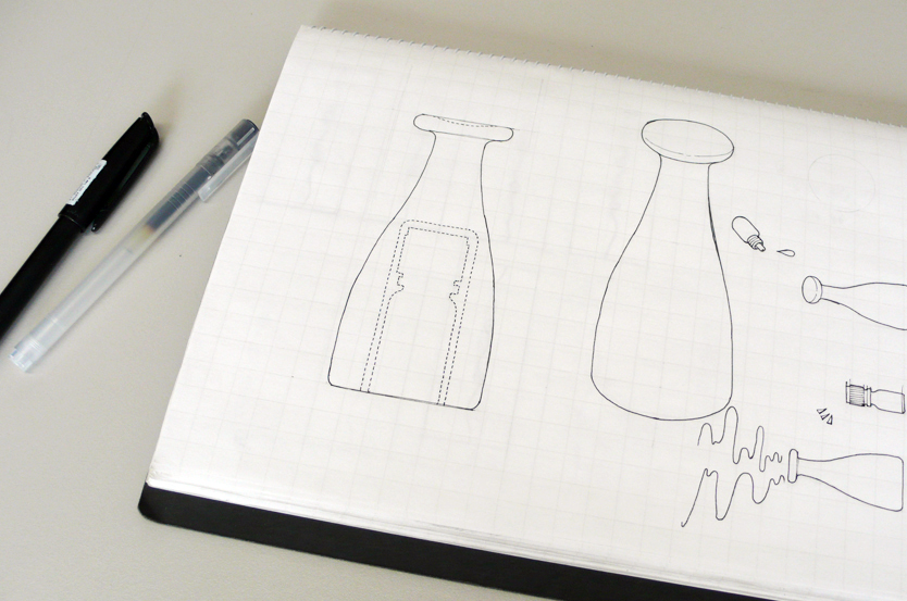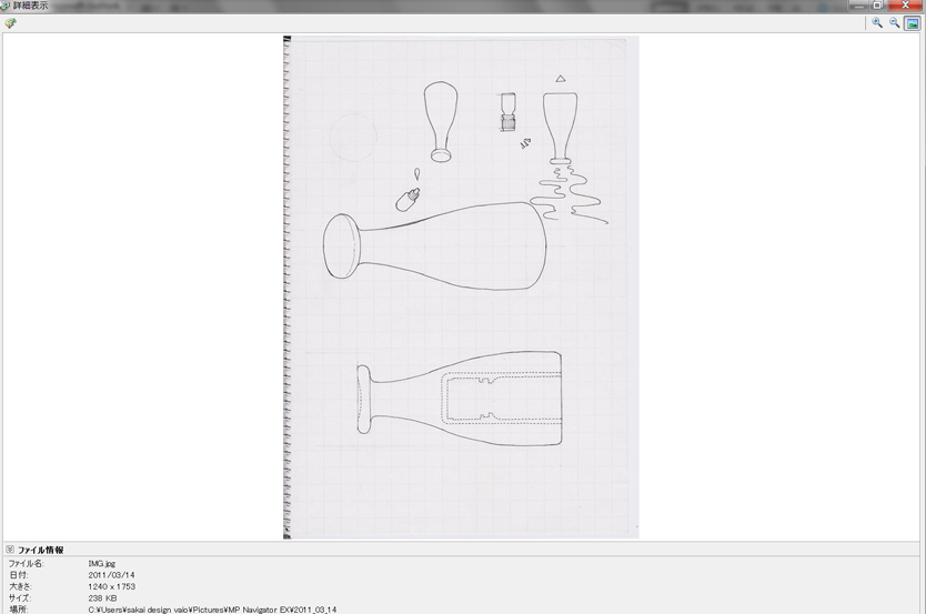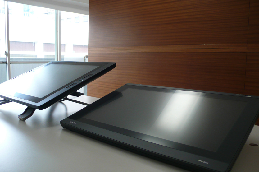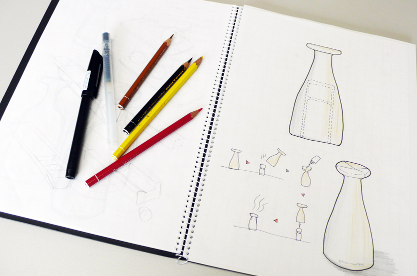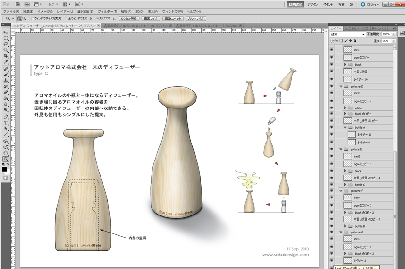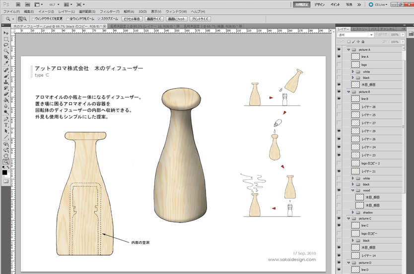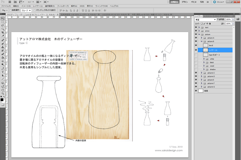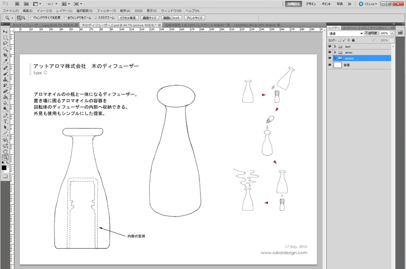 ●プレゼンテーション資料は手描きベースで うちの会社では、最初のプレゼンテーションは基本的に手描きベースのスケッチで行います。もちろん、IllustratorやCGで描いたものの方が見栄えがよく、クライアント受けすることが多いのですが、それだと「線」がすべて最初のプレゼンで決まってしまいます。クライアントはスタイリングコンセプトの良しあし判断する段階で、最終スタイリングを決めることに気持ちを持っていかれてしまうのです。そうならないために、できる限り「線」が決定できない、スタイリングの方向性だけを話し合えるのにちょうどいいプレゼン資料が必要になってきます。 この作業にワコムの液晶ペンタブレットはとても役に立っています。いつもは別のワコムの液晶ペンタブレットを使っているのですが、今回はCintiq 21UXを使って、普段の作業をフォローしてみようと思います。 ●手描き素材をPhotoshopでレイアウト ある程度スタイリングが決定したら、ざっくりした外形線をノートに描きます。プレゼン資料を作るのが目的なので、説明に必要な絵も一緒に描いてしまいます。 見ていただくと分かるのですが、左右の対象もいい加減で、修正した線もそのまま残っています。形を決め切らないで、「なんとなくこんな形」というニュアンスを伝えるためのスケッチです。描き終わったらスキャンしてパソコンに取り込みます。そのあと、レイアウトして、説明用の絵をコピペしてとりあえず下絵が完成です。 ここからやっとCintiq 21UXの出番です。