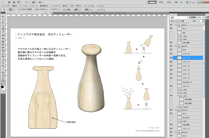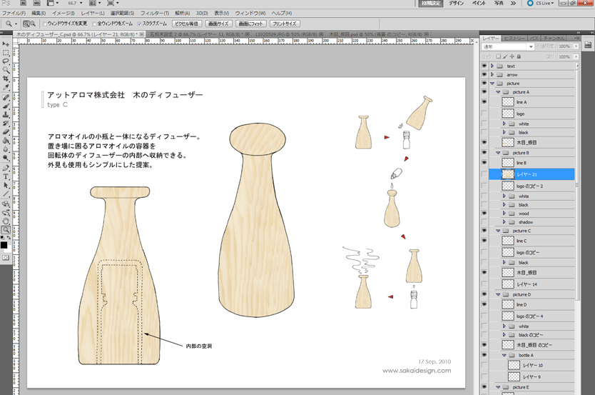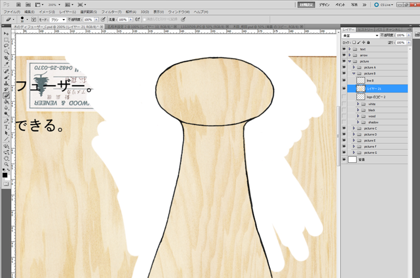●Cintiqで塗り絵 短時間で分かりやすい絵を描くには、本物のテクスチャを貼ってしまうのが効果的です。実際の突き板をスキャンして、それを下絵に塗り絵します。Photoshopを使っているので、「選択範囲内へペースト」でもいいのですが、スキャンした下絵が手描きの線だと、あまりきれいにいかないこともあります。なのでまず、外形線のレイヤーを乗算にして、その下のレイヤーにテクスチャを持ってきます。 その後順番に、はみ出した部分をペンタブレットを使って消していきます。マウスだとこういった不要部分を消していく作業が結構大変ですが、液晶ペンタブレットの場合、画面上に直接描いていけるのでとても簡単です。このくらいの絵だとだいたい5分で完了。「塗り絵」というより、どちらかというと「消し絵」です。
