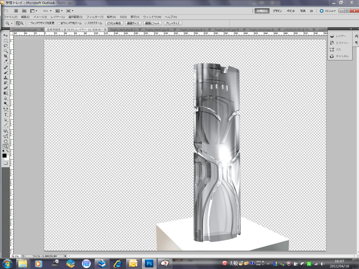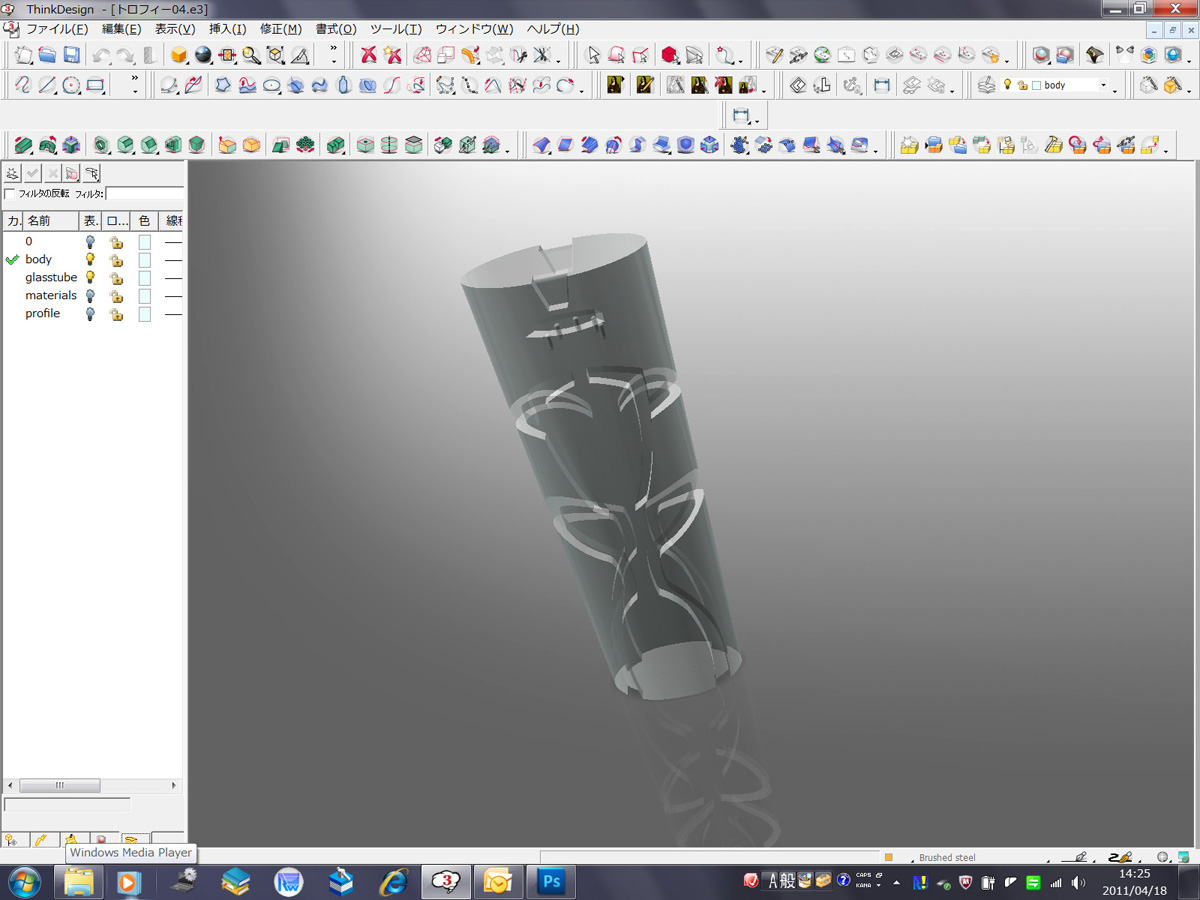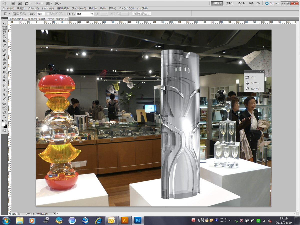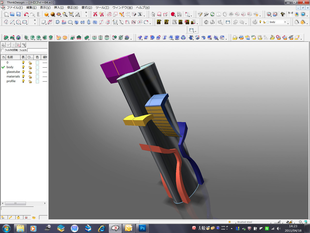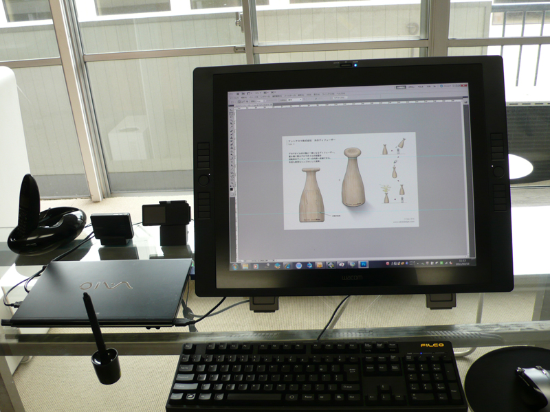 ●プレゼンテーション今昔 僕がデザインを始めた頃、MacではMacDrawとHyperCardが、DOS/Windows系のパソコンは花子と一太郎がソフトの主流でした。プレゼンテーションを行うとき、当時はコンピュータで作るのはまだ難しく、PANTONEペーパーに色鉛筆とマーカーで描いていました。 そんな時代を経ているので、世代的には、どう考えてもCGで作るよりアナログ制作の方が楽しいのですが、絵だけではなく3Dデータで確認したいという人たちが増えたので、CGによるプレゼンテーションを行うことも多いです。 そんなわけで、2回目はアナログ世代が「なんとか頑張って作っている」CG編です。若い人には参考にならないかもしれませんが、こういう手法にも液晶ペンタブレットのCintiq UX21はとても役に立ちます。 今回は2010年にAXISで行った「大トロフィー展」のトロフィーのプレゼンテーション制作を例に進めていこうと思います。ちなみに、「大トロフィー展」ではきちんとしたCGが必要なかったので作りませんでした。今回の例は実際に展示してあるトロフィーをCGに置き換えたものです。 ●3Dデータの派生物としてのCG まずCADで3Dデータを制作します。あらかじめ決まった形をデータにするという感じではなく、デザインを作り込む作業の一部として、CAD上で形を変えていくことが多いです。データが完成したところでデザインは完了するのですが、通常はもちろんその後にクライアントに形状を確認してもらう必要があります。コミュニケーションツールとしてのCGなので、時間を掛けずにざっくり作ったレンダリングをPhotoshopで合成していきます。 左利きなので、Cintiq UX21のペンだと左手で操作できるのはこの上なく便利です。例えばPhotoshopで作業するとき、パスもマウスよりペンの方が圧倒的に早く切れます。また、Cintiq UX21のファンクションキーに割り当てられた手の平ツールを使って、ペンで画像を移動させ、さらにトラックパッドの拡大・縮小を組み合わせて作業を進めることで作業効率も向上しました。
