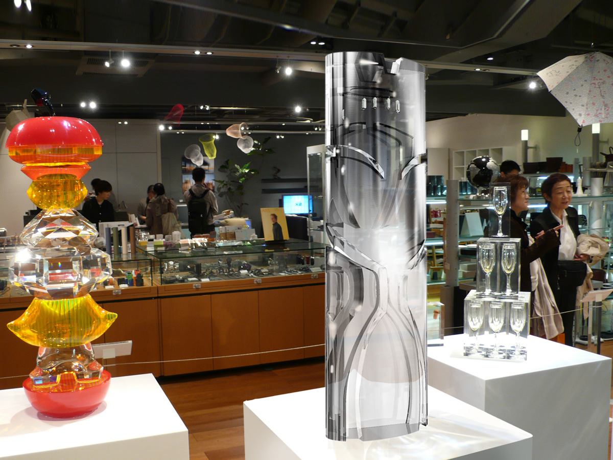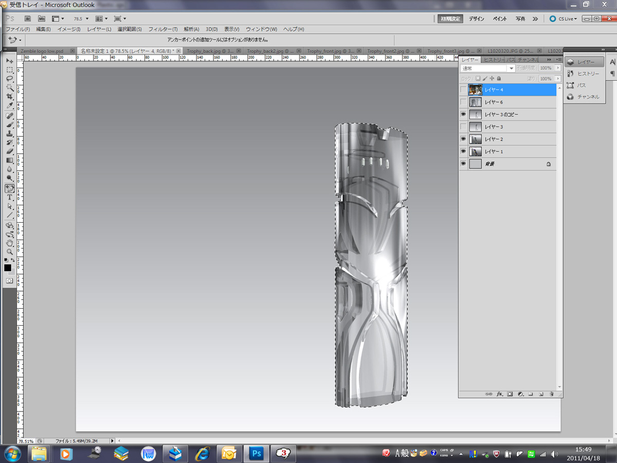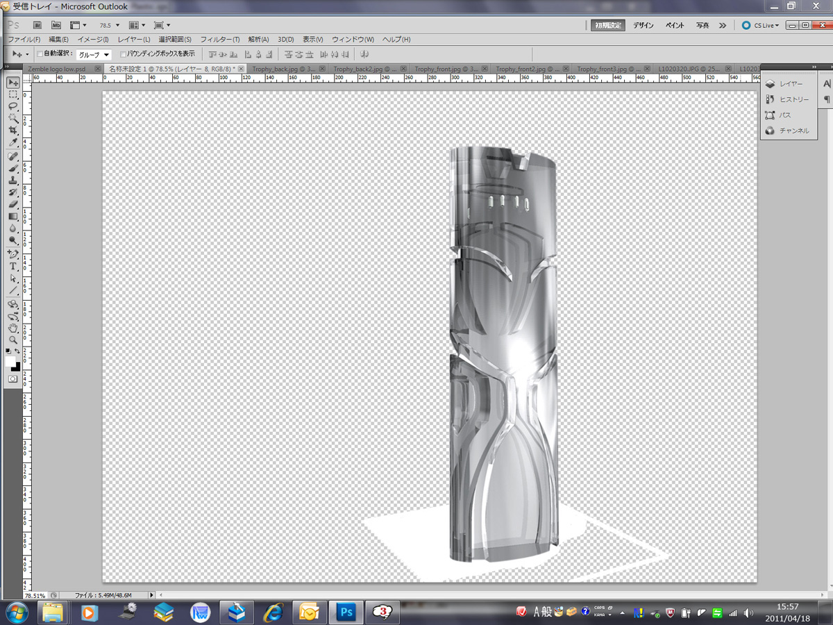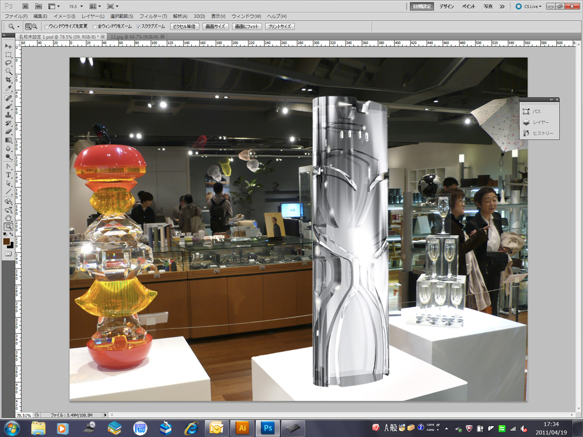 ●プレゼンテーション今昔 僕がデザインを始めた頃、MacではMacDrawとHyperCardが、DOS/Windows系のパソコンは花子と一太郎がソフトの主流でした。プレゼンテーションを行うとき、当時はコンピュータで作るのはまだ難しく、PANTONEペーパーに色鉛筆とマーカーで描いていました。 そんな時代を経ているので、世代的には、どう考えてもCGで作るよりアナログ制作の方が楽しいのですが、絵だけではなく3Dデータで確認したいという人たちが増えたので、CGによるプレゼンテーションを行うことも多いです。 そんなわけで、2回目はアナログ世代が「なんとか頑張って作っている」CG編です。若い人には参考にならないかもしれませんが、こういう手法にも液晶ペンタブレットのCintiq UX21はとても役に立ちます。 今回は2010年にAXISで行った「大トロフィー展」のトロフィーのプレゼンテーション制作を例に進めていこうと思います。ちなみに、「大トロフィー展」ではきちんとしたCGが必要なかったので作りませんでした。今回の例は実際に展示してあるトロフィーをCGに置き換えたものです。 ●3Dデータの派生物としてのCG まずCADで3Dデータを制作します。あらかじめ決まった形をデータにするという感じではなく、デザインを作り込む作業の一部として、CAD上で形を変えていくことが多いです。データが完成したところでデザインは完了するのですが、通常はもちろんその後にクライアントに形状を確認してもらう必要があります。コミュニケーションツールとしてのCGなので、時間を掛けずにざっくり作ったレンダリングをPhotoshopで合成していきます。 左利きなので、Cintiq UX21のペンだと左手で操作できるのはこの上なく便利です。例えばPhotoshopで作業するとき、パスもマウスよりペンの方が圧倒的に早く切れます。また、Cintiq UX21のファンクションキーに割り当てられた手の平ツールを使って、ペンで画像を移動させ、さらにトラックパッドの拡大・縮小を組み合わせて作業を進めることで作業効率も向上しました。