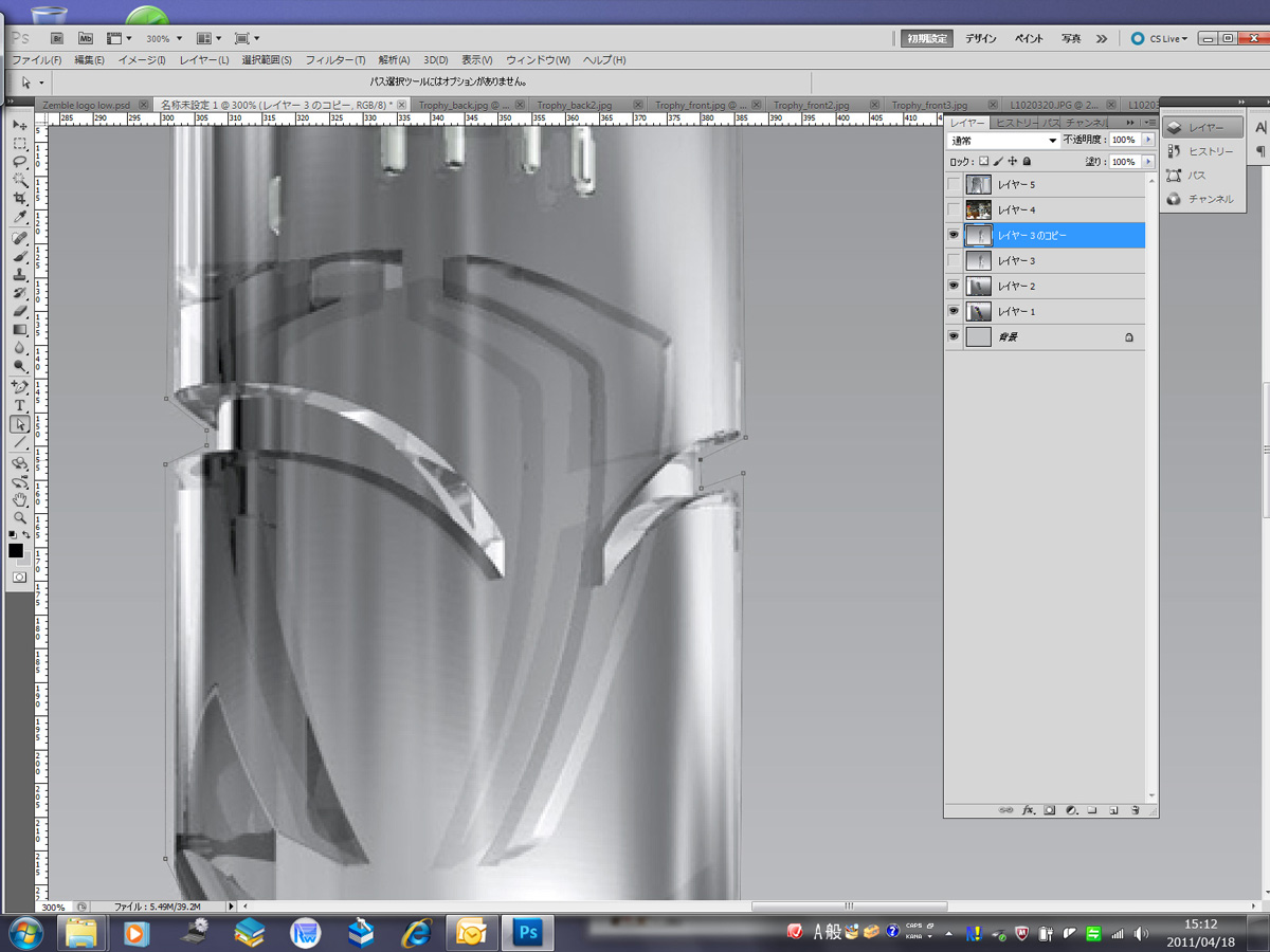 ●会場写真とトロフィーの合成 会場写真とトロフィーを合成するための台はPhotoshopのブラシで制作します。細めのブラシで3面それぞれシフトキーを使いながら外形を描いて、中を塗ります。面が不自然にならないよう、グラデーションをつけて馴染ませます。 次に会場写真とトロフィーを合成するのですが、トロフィーだけがどうしても浮いてしまいます。そこでトロフィーをいくつかのレイヤーにコピーして、乗算や比較を組み合わせ、透明度を出していきます(今回は背景にべた塗された実際のトロフィーがあるので、CGのトロフィーは不透明のままです)。その後ハイライトを入れると、だいぶそれらしくなってきます。