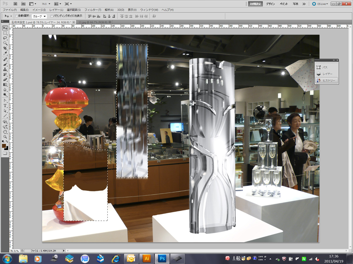 ●細かなディテールを加えて完成 最後に、撮影した映り込みを加えて完成です。映り込みといっても別の写真のキラキラした部分や背景を重ねて、周辺を消しゴムツールでボカすだけです。アクリルの歪みに合わせて、多少形状に手を加えます。下の真ん中の写真が最終のCG、右側の写真が撮影した実物です。 今回、Cintiq UX21を実践で駆使していくうちに、トラックパッドの使い方を覚えました。裏側にあったんですね。キーボードのショートカットのように操作が早くなりますし、画面を操る感覚が面白いです。 |