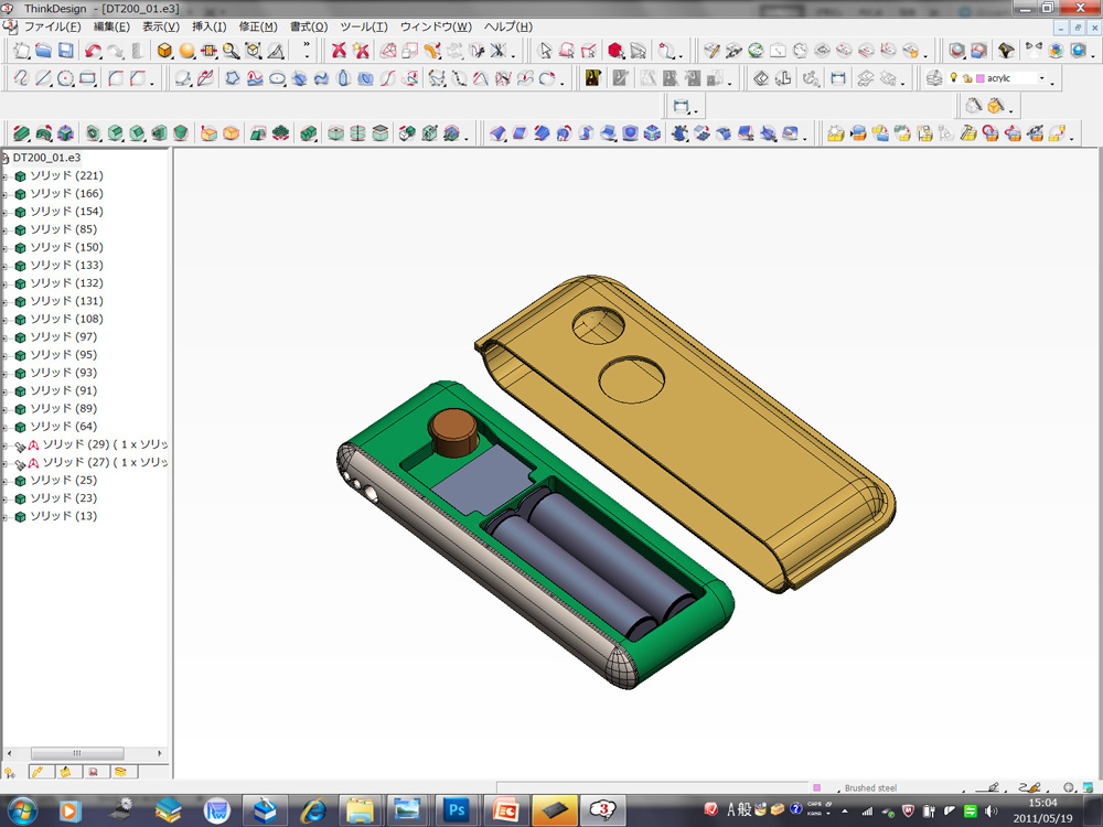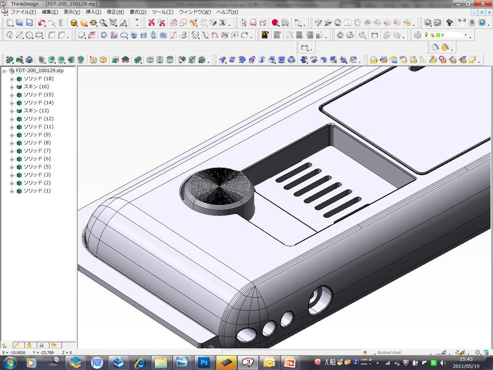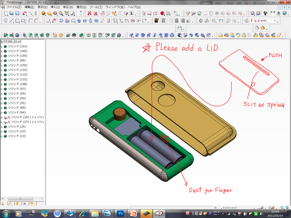 ●CintiqとPhotoshopで修正を施す デザインが一通り完成するとモックアップでの確認を経て、実際の製品を作るためのデータのやり取りが始まります。この部分はデザイナーによってどこまで関わるか大きく違ってきます。僕はエンジニアと一緒に最終金型までデザインを変更していく手法を取っています。可能な限り製造効率に関わる提案を受け入れ、細かく内部レイアウトを確認するのもデザイナーの仕事だと考えるからです。 そうするとCADデータをやり取りしながらの根気のいる作業が始まります。以前は3次元データそのものを修正して送り返していたのですが、使ってるCADが違うとお互いが何度も面を張り直したり、ほんの少し形状が変わるだけで修正が全体に及んだり、何かと効率が悪かったので方法を変えてみました。