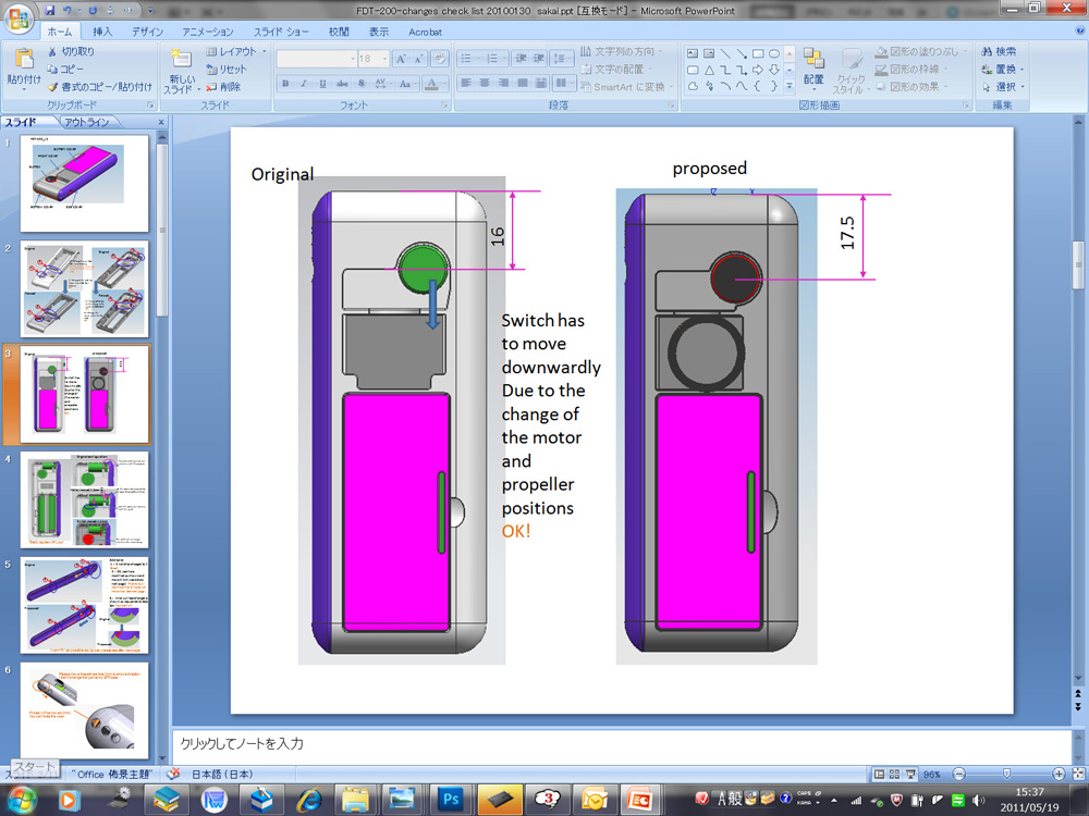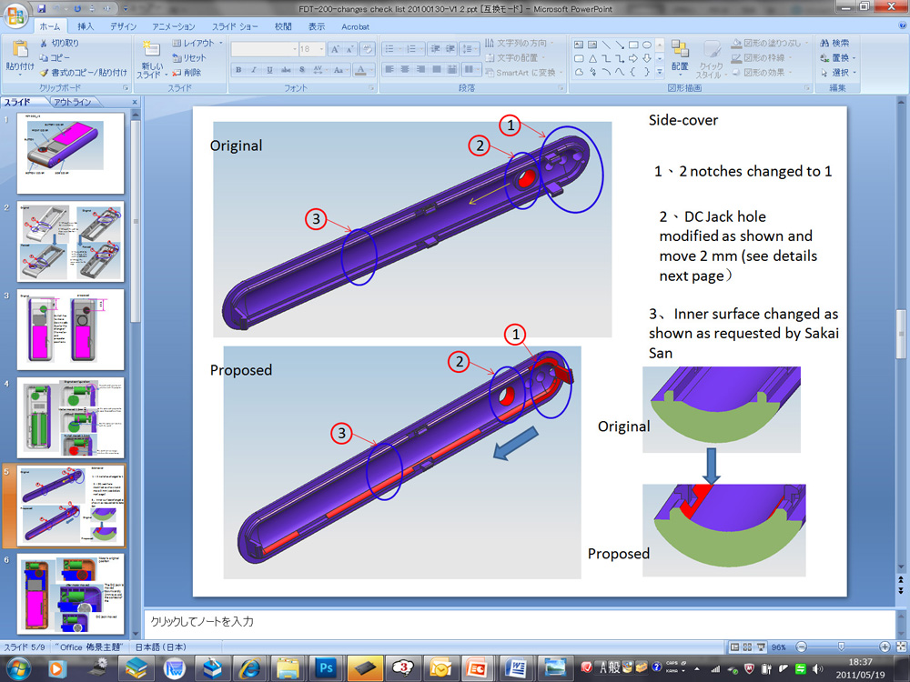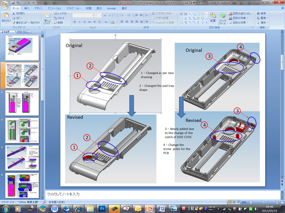 ●確認と変更の嵐 蓋のデータとともに大量の「変更の確認資料」がPowerPointで送られてきます。一緒に送られてきたSTPデータを確認しながら、それぞれにOKを出したり、再変更をお願いしたり細かな指示を出していきます。エンジニアが外国人の場合、実際のデータ変更で対応するとこちらのデータがノーチェックで金型データになったりするリスクがあったのですが、データ制作を省略することでこのリスクも同時に減らすことができました。