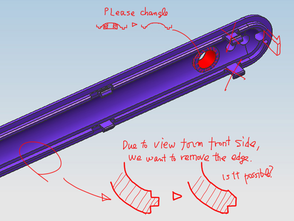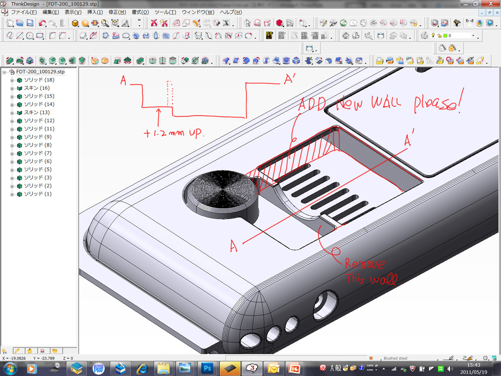 ●ボタン周りの変更 たくさん送られてきた変更確認の一例が、ボタン周りです。工場側は生産効率も考えて、この部分を「カバーの中の見えない部分」として形状の変更を提案してきました。デザインサイドとしては「カバーを取ると見える部分」なので、なるべくシンプルな形状にしておきたいところです。フィレットのかかったPro/EのデータをThinkDesignで修正すると時間がかかってしまうので、ここもCintiqでさっと指示書を制作します。受け取ったCADデータをプリントスクリーンでPhotoshopに取り込みます。あとは手書きで修正を書き込んで終了です。作業時間は5分程度。単純な作業ですが、もっと細かく指示する場合もあるのでマウスや通常のペンタブレットより、液晶に直接描けることが重要です。
