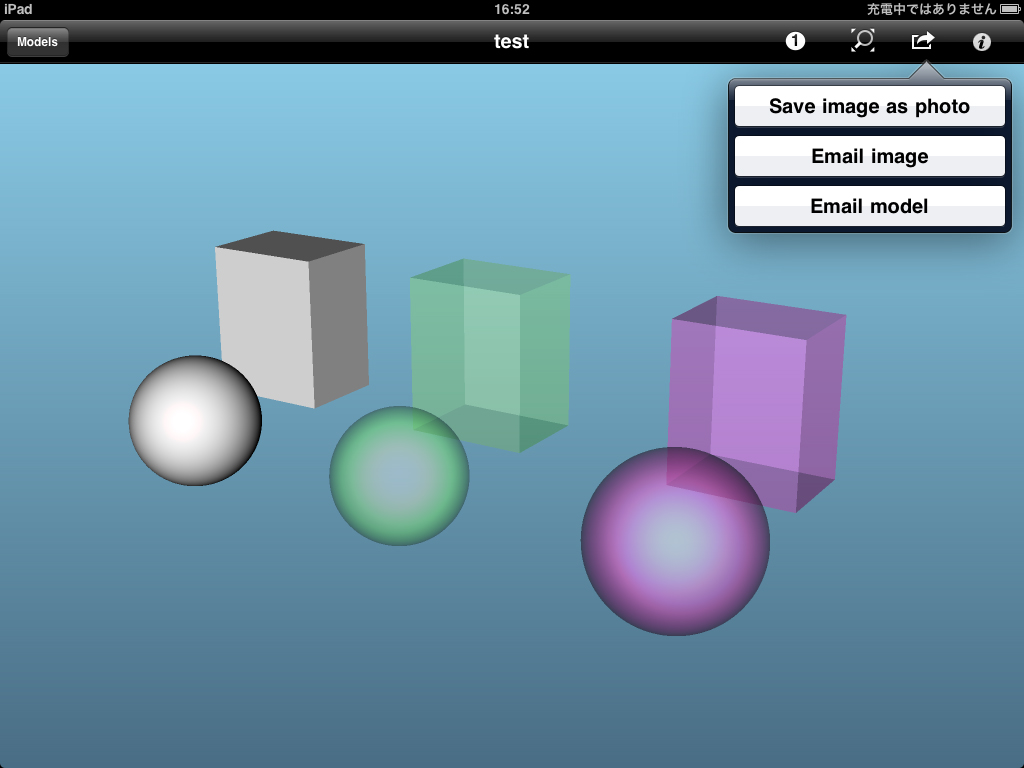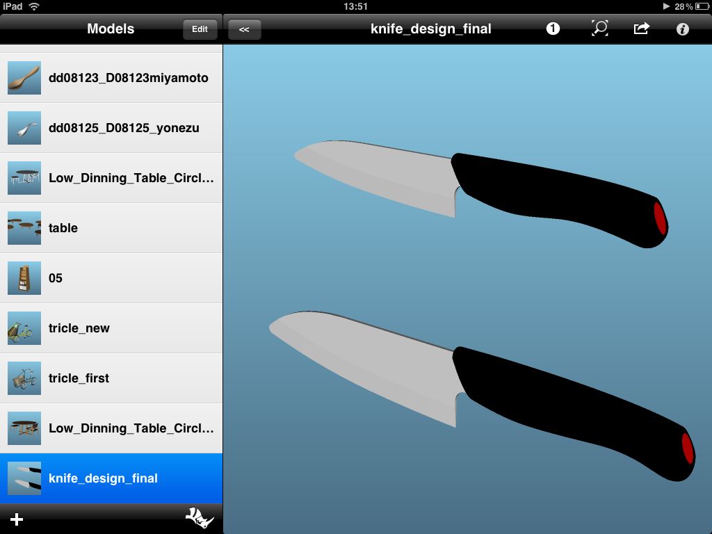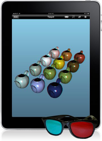 ●操作方法 表示されたモデルは、非常に滑らかで高速にズーム、パン、回転が可能となっており、iPhoneでもお馴染みのマルチタッチによるモデルのビューを感覚的に操作することができる。 また、画面右上の「1」と書かれた丸のアイコンに触れることによって、画像が赤と青のぶれた表示に切り替わり、3Dメガネを用いてステレオモードで眺めることが可能となっている。