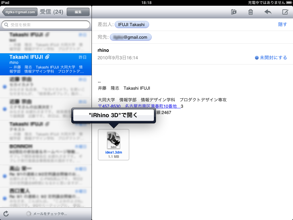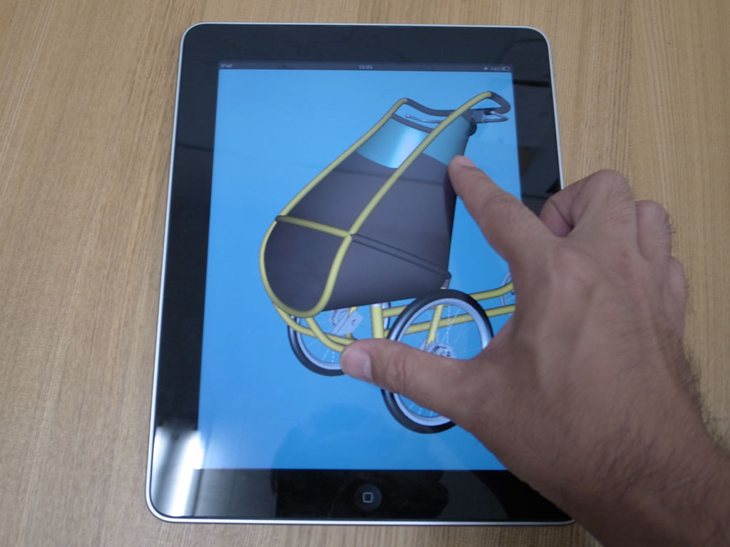 この薄い1枚の板状の画面に映し出される3Dモデルは、いずれは実現するホログラフィーによるプレゼンテーションの一歩手前まできていることを感じさせる。 近年の3次元造型機によるモックアップを前にしたコミュニケーションが最も効果的ではあるが、手軽で気軽に3Dモデルを見ることができるビューワは非常に有効であり、プロダクトデザイナーのみならず、当初より3Dビューワを必要としていた設計者や経営者にとっても魅力的なツールとして広がっていくであろう。 ただ、残念なことにVGA出力アダプタを使用してもプロジェクタなどの外部機器に出力することはできないため、多くの人前で使用するのには向いていない。私が教えている授業の課題プレゼンにiRhino 3Dでモデルを発表させたが、外部モニタ出力ができないため、書画カメラを用いて発表を行った。 現在iRhino 3DはiTunes App Storeにて450円で購入可能である。本家のRhinoceros 4.0はWindows版のみとなっているが、現在Rhino OSXが開発されており、先日発表されたAutoCADのMac版リリースの吉報とともにMacユーザーは首を長くして待っている状態である。