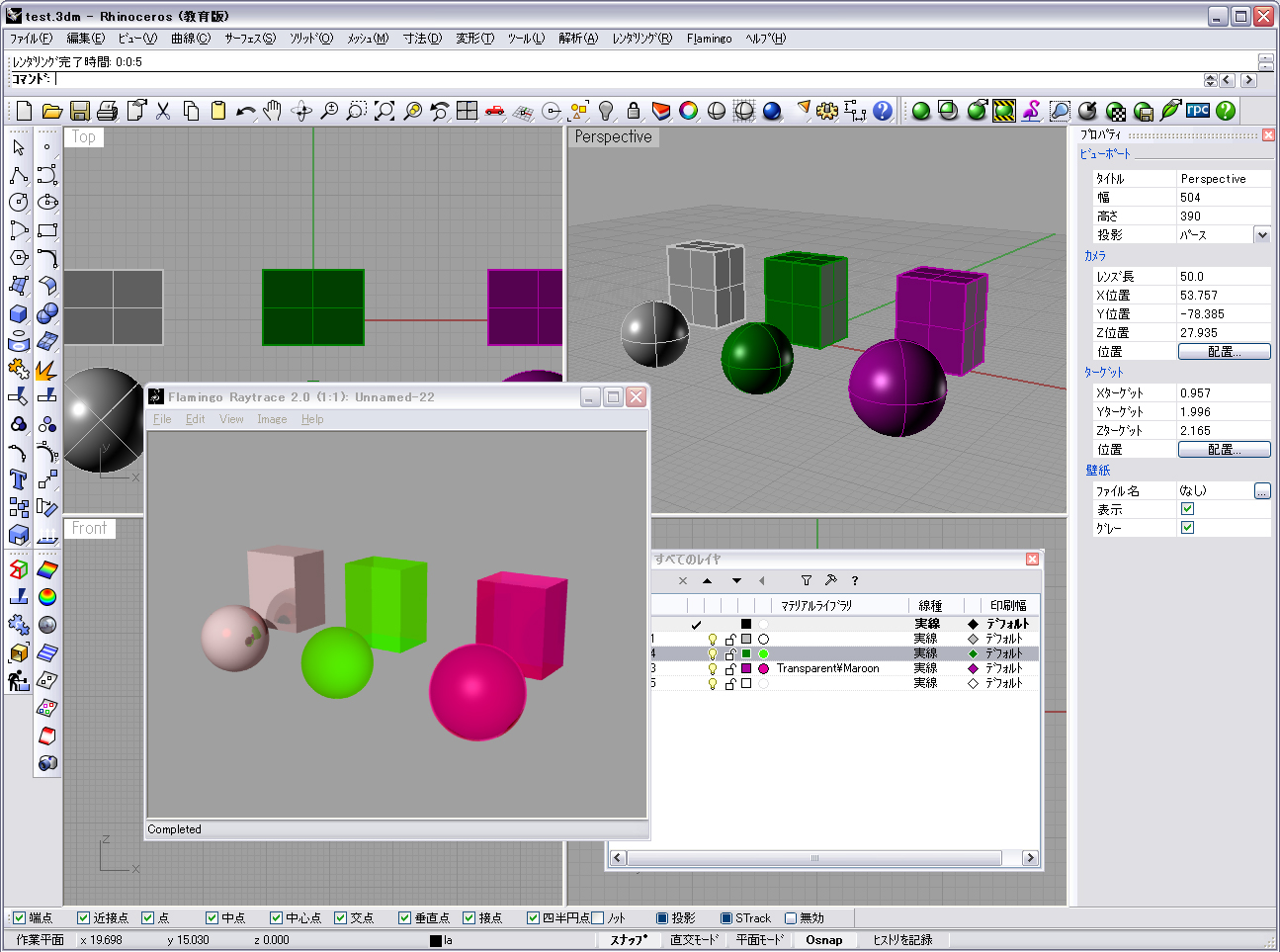 モデルの表示はシェーディングのみとなっており、近年のリアルタイムレンダリングと比較すると見劣りがするが、外部先のビューワとしては現時点では十分であろう。 注意しなければならない点は、Rhinocerosのシェーディングは、レイヤー色で表示されるのに対し、iRhino 3Dのシェーディングは、マテリアル色で表示される。よって、iPadに移動する前に必ず、マテリアルを設定してから取り込む必要がある。ちなみにマテリアルの色の他、透明度が反映されるようである。