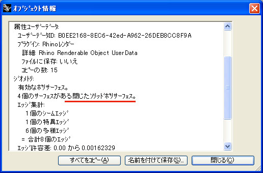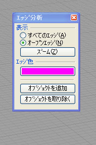 ●フィレットの処理後には必ず面のチェックをする 実際の仕事でフィレット加工をしていくと、本当は大きいRがつけたいのに、CADの計算上不可能なケースに直面するものである。ここでフィレットコマンド以外の方法で強引に大きいRをつける手法もあるのだが、紙面の関係上また別な機会にしたい。しかしながら、苦労して妥協範囲内のフィレットが成功した場合でも、画面上はきれいに見えていても実際には面が破綻しているケースがある。もし万が一、面が破けていたりしたら、後々の工程でブーリアンが出来なくなってしまうなどの危険がある。その後で不具合を防ぐためにも、フィレット作業の後は、必ず「プロパティー/詳細/」でオブジェクト情報のウィンドウでオブジェクトが閉じているかどうかを確認することを強くお勧めする(画像4)。 複雑なエッジを加工した場合などはさらに念入りに、調べる必要がある。その場合は「解析/エッジツール/エッジを表示/OPENエッジを表示」で、仮にフィレットがうまくいかず隙間のある部分があれば、そのエッジがピンク色で表示されるので、その隙間部分の形状を自然な形に修正してから再度フィレットをかければうまくいくはずである(画像5)。一般的に、小さいRのほうが問題なく面が加工できるものである。どうしても意図した大きいRがつけられない場合は、形の作り方自体を全面的に変更する必要性が出てくる。そうなると、締め切り時間との勝負となってくる。そのためにも、CADの操作自体はスピーディーに扱えないと、膨大な時間のロスとなってしまう。