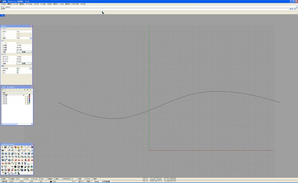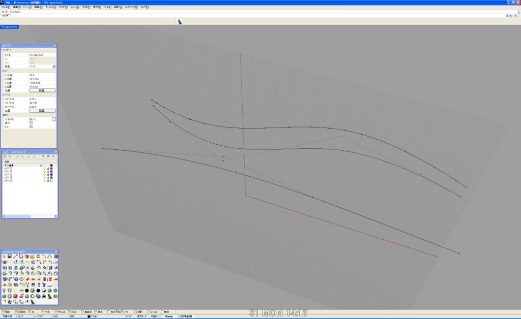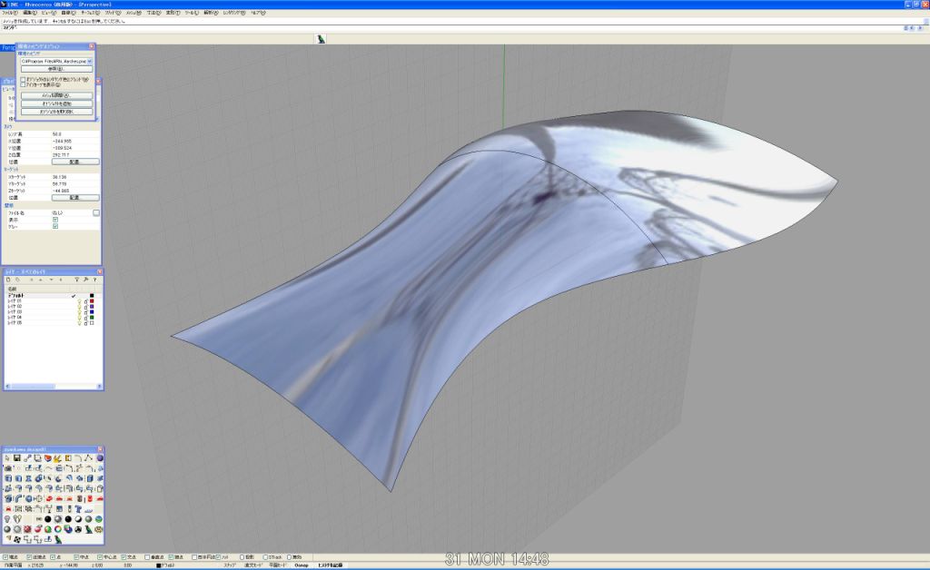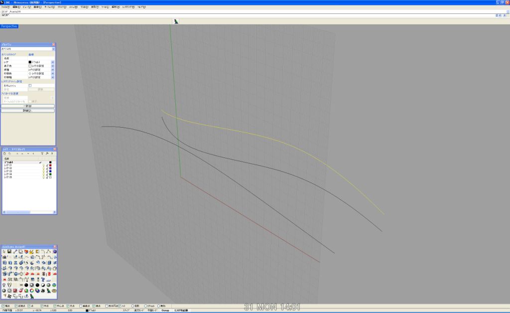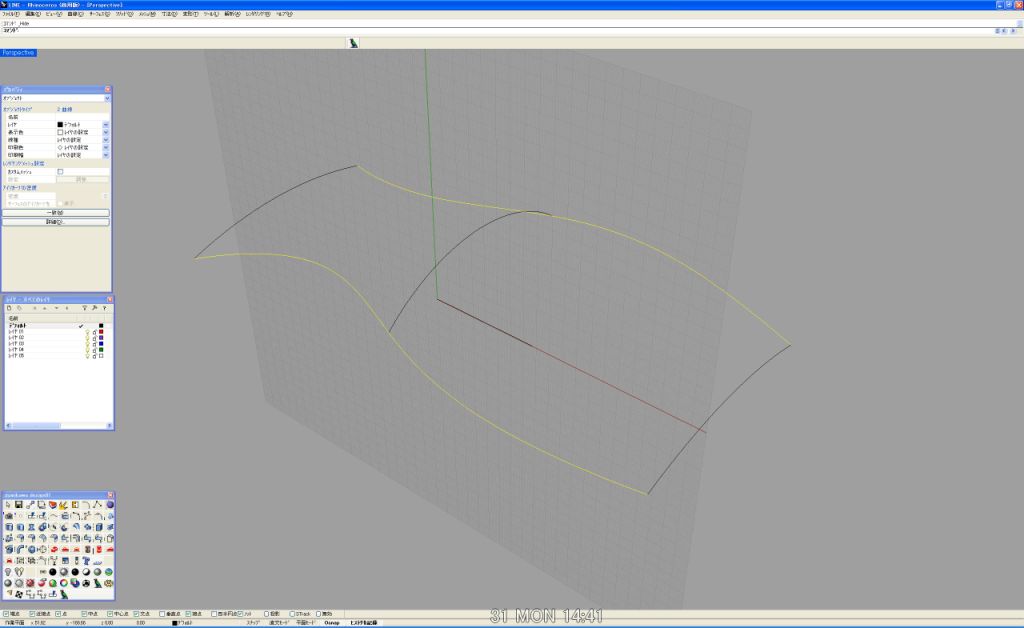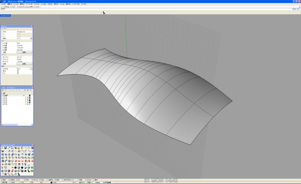 ●3次曲線間に変化する断面を張る 前回、2レールスイープの機能を紹介したが、この機能は非常に使用頻度が高いので、もう少し補足的な内容も含めて今回も解説してみることとした。 2本のレール状のガイドラインを、断面のラインが変化しながら流れるように面を構成していくというのが基本的な2レールでの面の張り方なのであるが、実は断面のラインの調整とともに重要になってくるのが、2本のレール自体の調整なのである。 タイトルの写真にあるのは、以前デザインさせていただいたTOTOの大型浴槽だが、見てお分かりの通り、海面の持つダイナミックなうねり面の表情を浴槽の造形に再現してみたデザインである。このうねりの造形においては2レールスイープの反復作業の地道な集積で作られている。結果としてこの浴槽は非常に高価な商品であるにもかかわらず、ショールームには運転手付きのお客さんが見えられて購入していかれるとのこと。うらやましい世界であるが、私は浴槽以前にまず運転手が欲しい(笑)。 ところで、この浴槽の最大の特徴であるダイナミックな面の変化は、実はガイドとなるこの2本のレール自体が3次曲線で構成されている部分にヒントがある。3次曲線間に変化する断面を張ることで、良くも悪くも造形の段取りを複雑なものにしているのであるが、結果、表現力としては非常に効果が出ている。学生さんのポートフォリオで、いかにも3次元CADでデザインしました風な作品がよくあるのだが、面自体が非常に単調で奥行きの浅いものが多いのが気になる。シンプルさと単調さとはまったく異なるものである。 単純な掃引体や回転体はそれ自体は美しく決して悪くない。しかし、道具として一歩踏み込んで考えれば、一見シンプルな造形の中でも、さらに工夫して考えられた奥行きを感じる造形を作り出すことができ、そういったさりげない味付けが商品価値を上げていくのである。そして、そんなさりげないエッセンスのヒントとしても、一歩踏み込んだ2レールスイープを身に付けてほしい。今回は3次曲線間に変化する断面を張るという段取りを簡単に説明してみたい。3次曲線の作成時に起きる問題とその解決法も同時に理解してほしい。 ●作業手順 今回はまず、任意の3次曲線を作成してみる。まずは、TOPビューで任意の二次曲線な曲線を作成(画像1)。 次にこの曲線をFRONTから見た形状で作成。曲線の始点終点の位置の制約などがあればこの段階でしっかり抑えておく必要がある(画像2)。 よく使用するコマンドが、2つのビューから曲線を作成というものである。これはメニューから 「曲線」「2つのビューから曲線を作成」で、今作成した2つの曲線を作成すればよい。ここでは新たに作成された曲線が黄色く表示された状態となっている(画像3)。 この段階で実は、非常に注意が必要な問題が発生している。このまま作業を進めていくと後のフィレット処理の段階などで加工上の限界にぶつかってしまう可能性が高いので、ある処理が必要になってくる。その問題とは何か? 答えは制御点の増大である。ちなみに、TOPから見た最初のラインは6個の制御点であり、FRONTからのラインは4個の制御点しか存在していない。ところがこれが3次元のカーブを作成してみると、制御点はなんと20個にも増大しているのである(画像4)。 このまま作業を進めていくと、この大量の制御点が予測のつかない面のねじれや歪みを引き起こす原因となる。これを解決する方法として、新しく作成したこの曲線のイメージを保ちながら、制御点を削除していく方法をとる。 手法としてはいくつかあるのだが、例えば、メニューから「編集」リビルド」で曲線を選べば、ダイアログボックスが現れる(画像5)。私の場合は次数は変えずに、上の制御点を減らしながら、曲線のイメージを保てるバランスを探すようにしている。 どうしてもリビルドでうまくいかない場合は、この3次曲線の数箇所を選んで、新たに自由曲線を作成してそれを修正していくこともある。この曲線の修正作業は、必ずいろいろなビューで確認しながら作成していくことが非常に重要である。少しでも妙に歪んでいるような箇所があれば、面を張ったときにその箇所の気になる部分は誇張されると考えて間違いがない。まるで、仮想空間の中に入り込んで針金を曲げていくような作業であるが、デザイン作成の工程の中でも最も時間をかける作業かもしれない。浴槽のデザインなどの場合だと、この作業だけで試行錯誤を1週間以上かける場合も少なくない。 そして、結果的に制御点のシンプルな意図する曲線が出来上がった段階で、2レールスイープの作業に入る。ここでは単純に今の曲線をミラーにしてみて、任意の断面曲線を設定してみた(画像6)。出来上がった曲面をゴースト表示してみたのが画像7。ラインがよれずにきれいにつながっているのが確認できる。制御点が多すぎると、この面の上に表示されているラインの密度が高すぎて真っ黒に