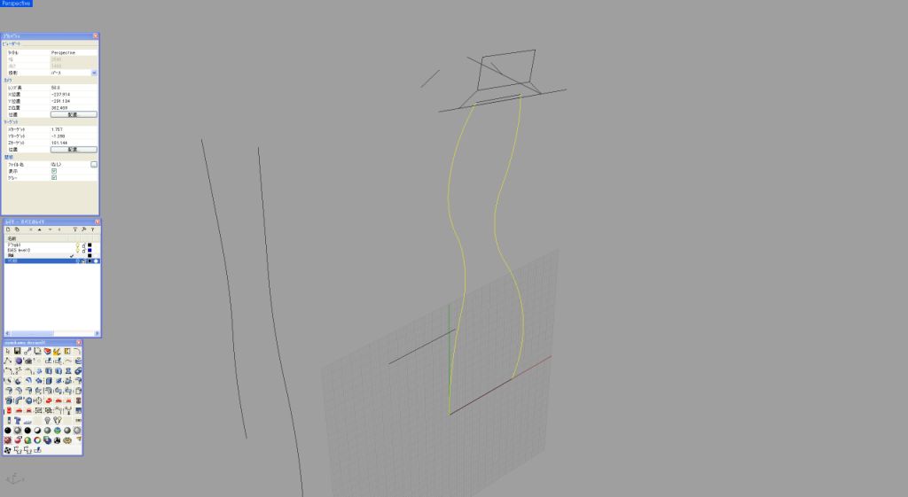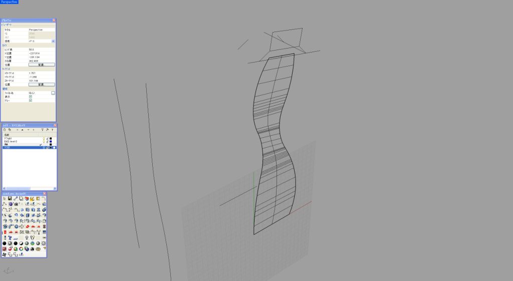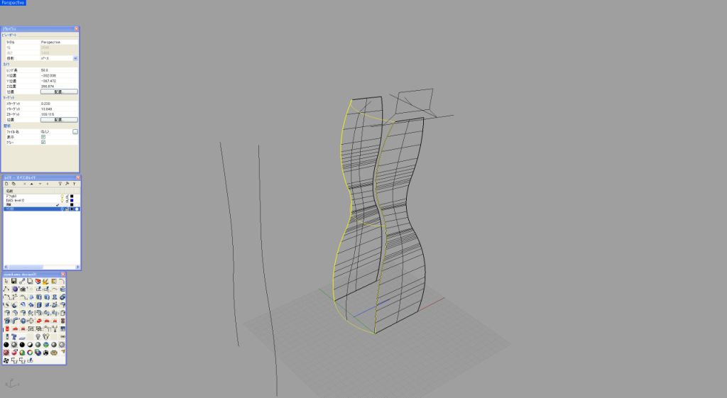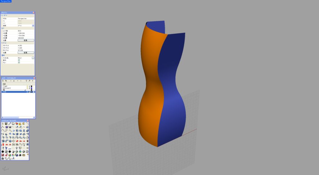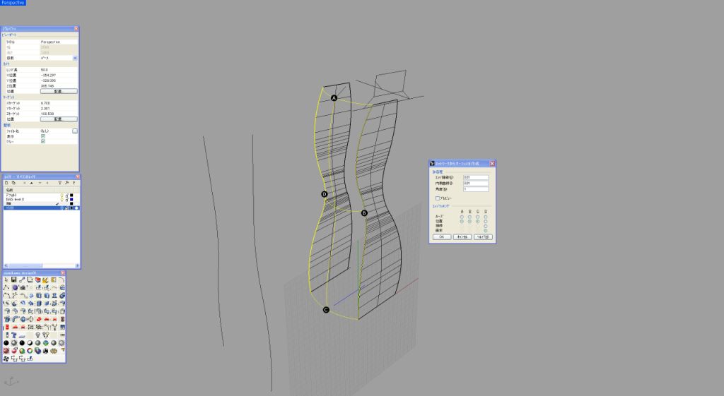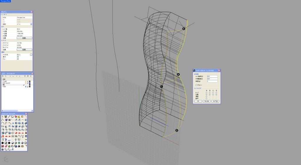 私いつものように基本は2次元で作成する。このデザインの場合、中央の帯状の2次曲面がポイントとなるため、この曲面のサイドのラインが、あとあとかなり重要な役割となってくる(画像1)。この2次曲面を90度前方向から見た曲線を設定する。この部分はボトルを握ったときに直接感じる厚みになるために、原寸で何度もプリントアウトして検討する必要がある(画像2)。 メニューから、「曲線」「二つのビューから曲線を作成」でこの2次曲面のアウトラインが出来上がる(画像3)。ここではこの面はシンプルに2レールで作成する。断面曲線は直線なので、あとあと問題になるような面はできにくいと予想される(画像4)。特に問題がなさそうな面なので、このまま作業を続ける。このワイヤーフレームの段階でラインが妙に多いと感じたときは、制御点を少なくするような作業が必要になってくる。問題がなければ、このまま中心線を軸としてミラーコピーする(画像5)。ミラーコピーしたものを、レンダプレビューでチェック。厚み具合も大丈夫そうなのでこのまま進める(画像6)。 ここからこの2次曲面をつなげる3次曲面の作成に入るのだが、まずは2レールでやってみようと思う。画像1の2次元での側面図の最大外形ラインをピークとして、両サイドの2次曲面とを結ぶ円弧を設定してみた。この3つの弧を断面とする2レールで面を張ってみる(画像7)。2レールで作成した面が画像8である。瞬間的に見ただけでちょっとバランスがよくないのが分かる。弧を設定した箇所はイメージどおりでも、最大外形ラインから実際の面が外れているのが正面図にすると確認できる。確認のため、もう一度この画像1での重要なカーブを観察してみる。このラインから外れるのはやはり造形上、致命的である。ここで2レールではなくネットワークサーフェスで面を張ることにしてみる。メニュー「サーフェス」「曲線ネットワークから面を作成」で先ほどの2つのレールと3つの弧に加えて最大外形ラインも選択して、ENTERで詳細設定BOXが現れる(画像9)。 画像10はネットワークサーフェスモードでの詳細設定BOX画面。注意するのは下部のエッジマッチングの部分がここだ。自分でそれぞれモードを試してみれば結果がすぐに把握できるので、是非時間があるときに試してほしい。今回は稜線をまずはしっかり出したいので、アルファベットの部分はすべて「位置」を選択してある。ネットワークサーフェスで作成した3次曲面。画像8と比較してみると、曲面がきれいに連続しているのが分かる。指定どおりの最大外形のラインも保ちながら狙い通りの造形が出来上がった。通常、あえて最大外形ラインを設定せずに、Rhinocerosの計算だけに頼って2レールで面を張ることも実は多いのだが、今回のようにサイドビューのシルエットが重要な要素となっているような造形の場合は、しっかりとネットワークサーフェスで面を構築したほうがよい。このあたりの判断は自分で経験値を広げていく以外にマスターできる方法はない(画像11)。 ここで反対側の面もネットワークで作成。ここまでくれば、もう機械的に作業を進められる(画像12)。これで筒状の4つの面を張り終えたことになる(画像13)。画面を回転させてバランスなどをチェック。この後、上面、底面を作成して一度ソリッド化させて金型屋さんにチェックをしてもらう。受け渡しはSTEPを用いた。今回は番組のほうで、なんと実際のボトルの金型まで作成し、中量生産の試作まで行うことができた。ボトルの口の部分の加工は金型メーカーさんにお願いし、稜線のRは実際の想定よりも一回り小さいRを設定するのが、ガラスの材料を使用したときのテクニックである(画像14)。 Rhinoceros上ではレンダリングをプレビューで見せながらの打ち合わせをして、非常にスムーズにメーカーや企画サイドとのコミュニケーションがとれた(画像15)。