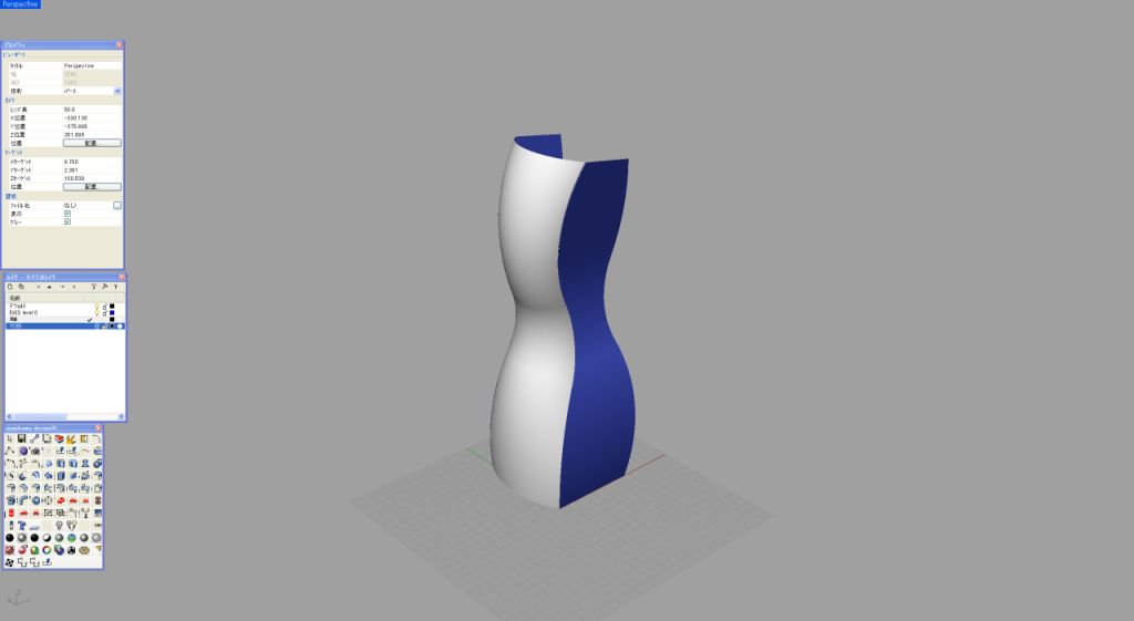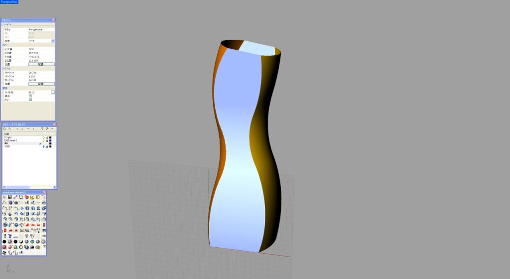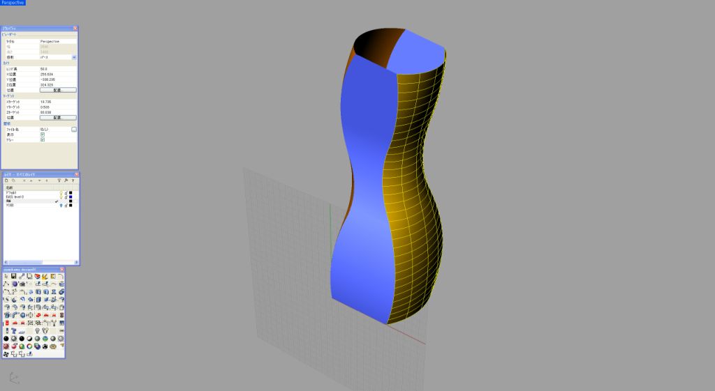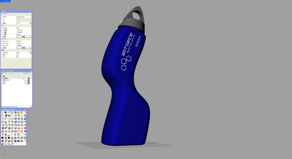 ●2レールスイープからネットワークサーフェスへ 私自身は2レールスイープを非常によく使うのだが、これと同じくらいに重要なコマンドが「ネットワークサーフェス」である。では、なぜこの機能が必要になってくるかを具体例で展開してみたい。コマンドを教科書のように順番に学ぶやり方もあるが、実戦で本当に必要な機能を力ずくでマスターしていくのが一番の早道だと思う。 先日、テレビ東京で「ガラス瓶業界をデザインが救う」という番組に出演させていただいた。そのときに作成したボトルのデザインがこのアスリートボトルである。くびれが握りやすく、お洒落なダンベル代わりにもなる。 実はこのボトルの造形は、2レールスイープとネットワークサーフェスを駆使して作成したものである。せっかくの機会なので、このボトルの記憶がまだ残っているうちに造形の手順について解説していきたい。