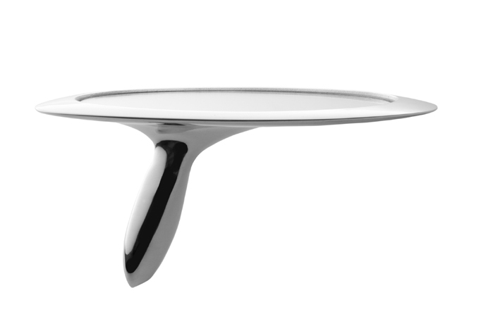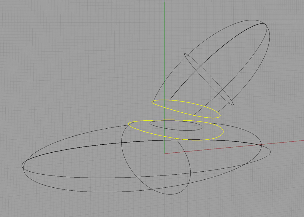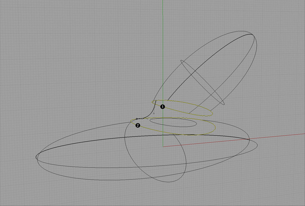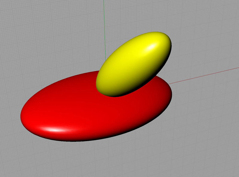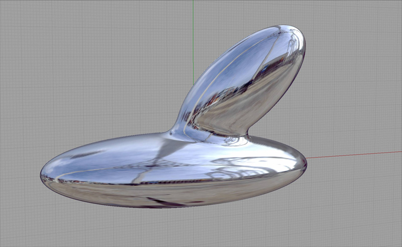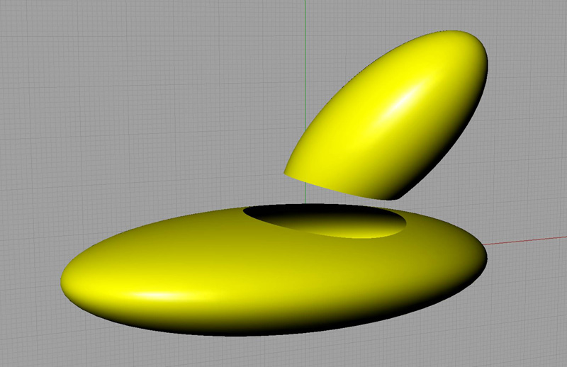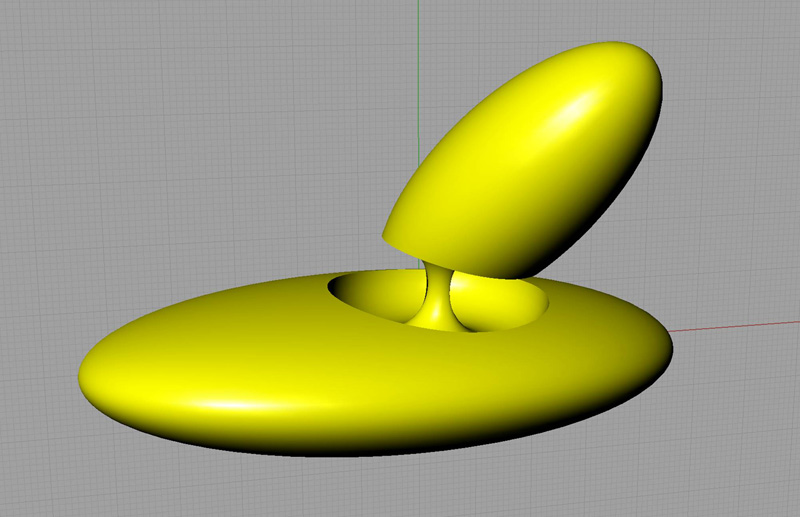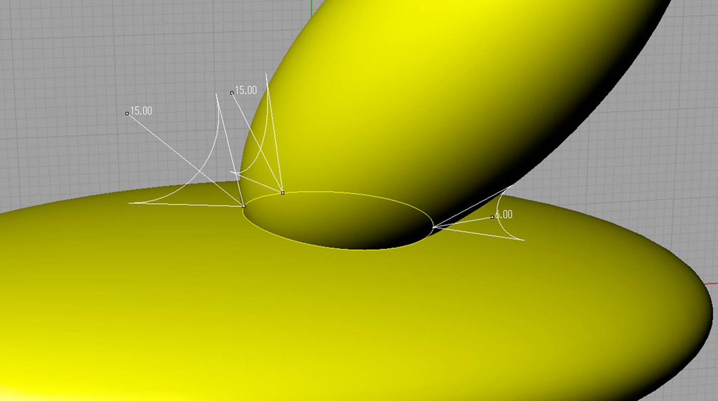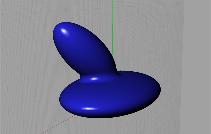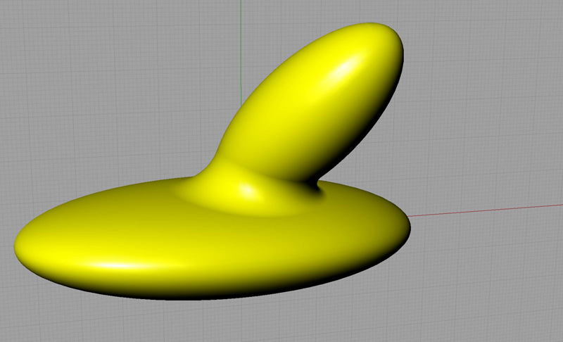 一般的に、画像1のような融合する形は基本的には物体と物体をぶつけてその境界線をぼかすという段取りとなるのだが、問題はその境界線のぼかし方である。 一般的なのは、まずソリッド同士(複数の形)をブーリアン演算の和で一体化させる(画像2)。そして、メニューから、「ソリッド」「エッジをフィレット」で物体同士の境界線を選択してフィレットを実行する。その際、単純にフィレットするのではなく、ローリングボール以外の構成にしてみることや、ハンドルを追加して、変化のあるフィレットにしてみることで狙ったイメージに近づけていくことができる(画像3、4)。このあたりの徐変Rでの造形は、ハンドルの追加とその位置関係の調整でかなり奥の深い形が出来上がるので、じっくりと時間をかけて形を追求する部分でもある。 また、少しでもCADで3次元のモデリングを試みたことがある人であれば分かると思うのだが、通常2次元画像面でとれていたフィレットの最大値が、3次元ではかなり小さくなってしまうということがある。面の変化率の度合いによってこのあたりのフィレットの数値は劇的に変化してしまうので、数字をメモしながらしつこいくらいにトライしていかなければならない。一見フィレットがとれたように見えていても、実はぱっと見では分からないサイズで面の破れが発生している場合がある。そんな怪しそうなときは、必ずオブジェクトのプロパティの「オブジェクトの詳細」で面が閉じているかどうかの確認を習慣化させておきたい。仮にフィレット後にオープンエッジが残っていたりすると、その次の工程でブーリアンができなくなってしまったりするので要注意である。Rhinoも4.0以降ではフィレットの微調整がかなり細かくできるようになっている。もし、3.0以前をお使いの場合はこのフィレットのことだけを考えても4.0にバージョンアップされることを強く勧める。 便利な微調整のきくフィレットであるが、形状によっては、フィレットのコマンドではどうにも狙った境界線のぼかしができないという壁に突き当たってしまう場合も実は数多くある。その場合、フィレットという考えは一度潔く捨ててしまい、一度面を切断してしまいその空いた部分に新しく面を張るという考え方に移行する。 一般的に面を切断するのによく使われるのが、境界線を使用してそこにパイプを作成し、そのパイプを使用して面を切断するという手法である。境界線が演算の関係で複数の線分となってしまった場合には、エッジの境界線を複製してそれらを結合させればよい(画像5、6)。ブーリアンでパイプ部分を引いてから、面を一度分解して、不要な面を削除する(画像7、8)。 ここで切断した2つの面の切り口のエッジを使って面を新しく作成していくのであるが、使うコマンドは、「サーフェス」「ブレンド」で切り口となる2つのエッジを順番に選んでいく(画像9、10)。その際、「ブレンドバルジの調整」というウィンドウで曲面の連続性を調整することができる。必ずしも初期設定の数値がきれいだとは限らないのでいろいろと試したほうがいいと思う(画像11)。 このブレンドで張った面は、フィレットのときよりもさらにダイナミックな面でつなげることが可能になる(画像12、13)。このブレンドを使った方法でも、実はパイプ自体の径を徐変させたり、パイプの位置をずらしたり大きさを変えたりすることで、さらに効果的な造形が可能になってくる。もちろんそこで大事なのが、自分自身の造形の美しさの判断力となるのはいうまでもない。2次元図面で、単純にRを数字だけで指定していたのが今では考えられない。Rといえども非常に重要なデザインの面の構成要素であることを意識しなければならない。 最後の写真(写真2)は、展覧会のために作成したアルミのハンドミラーである。魚が水溜まりに飛び込んだ瞬間のような形状である。普段は伏せて置いておく道具なのでこのようなデザインにしてみたのだが、今回のブレンドサーフェスの応用で作成した造形である。