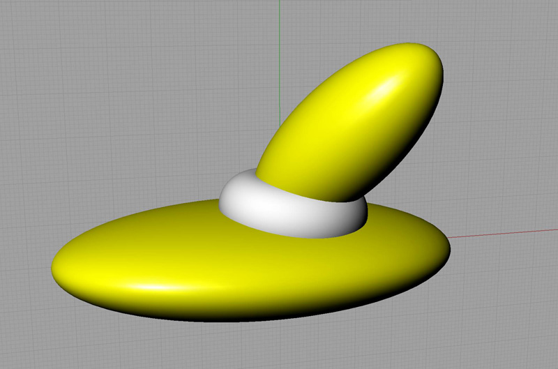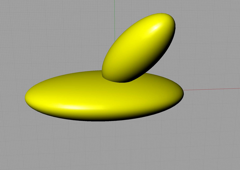 ●有機的な形状を作成するには 写真1は電車のつり革である。いろいろな部分をつかむことができるのでいろいろな身長の人にも対応でき、柔らかいので頭にぶつかっても痛くない。それぞれのホルダーは、そのまま手のひらのツボ押し機能も備えているというデザインコンセプト。そこで作成したモックアップは、Rhinocerosでモデリングしたものを光造形で作成。それをマスターとして、ウレタン注形で複製したものである。モックアップは随分と長い間あるデザインTV番組のオープニングに登場していたのでご記憶の方もいるのではないかと思う。 ところでこのようなつり革のような有機的な形状は、アメーバーっぽいというか、細胞分裂の瞬間のような形状であり、クレイなどでは作りやすいのだが、CADなどでは比較的困難とされる形でもある。今回は、このような融合する形状について考察してみたい。