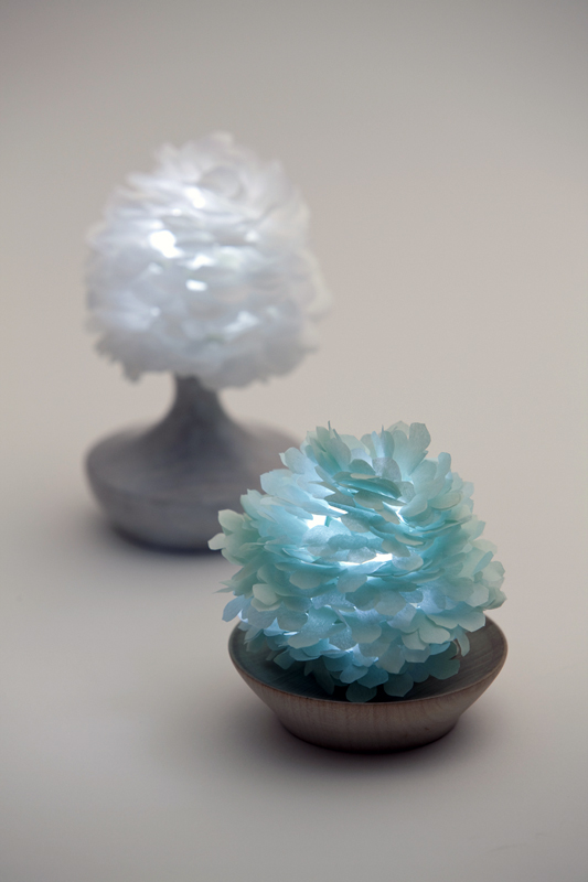こうして見つけ出した台座のラインをなるべく壊したくなかったため、電池など内蔵物スペースぎりぎりのラインをどこまで追い込めるかも課題だった。出来上がった試作を見ては何度も図面を書き直した。この部分の製作は、和傘の持ち手を作っている職人さんに、とても繊細な仕事をしていただいている。花部分も難しく、何度も試作を繰り返し、花の密度や本体への取り付け方など、納得がいくまでの道程が長いところもあった。