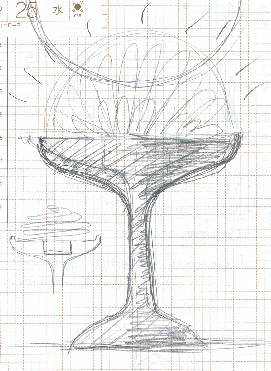 もう1つは、かたちを探すスケッチ。のびのびしたストロークで実物大に描く。押さえておきたい寸法のアタリの上から、求めている線を探す。画材はやわらかい濃色の色鉛筆が、気負うことなく曖昧な線を重ねることができるので好みだ。その見つけた線をそのままスキャン&トレースして外形データに起こすことも少なくない。