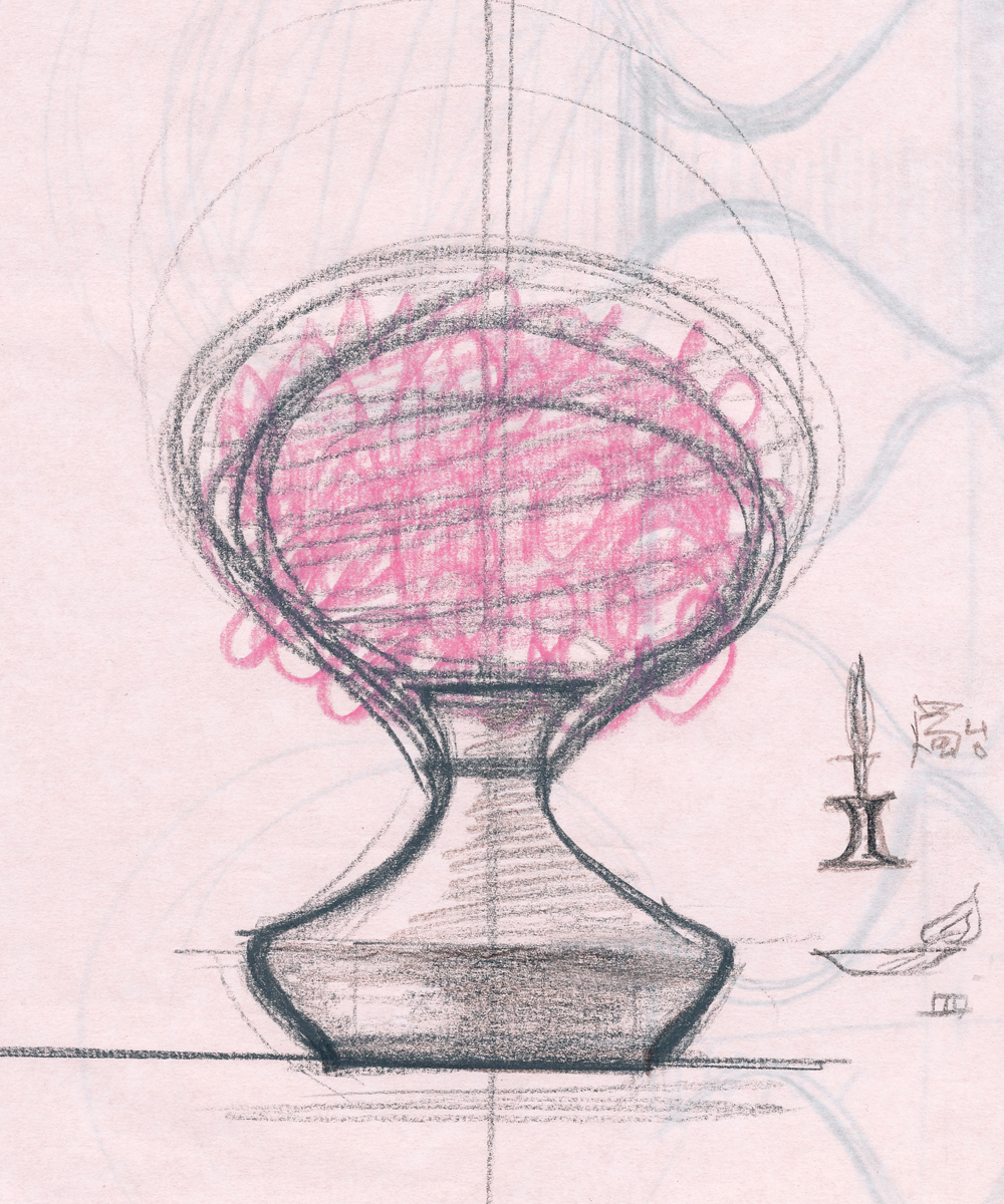 さて、そこから実物大の線を探すスケッチが始まった。花部分との固定方法など、実際のプロダクトにするにはこの時点では課題も多く、紙の造作や花びらを固定する芯は、このスケッチでは曖昧なままである。全体をやわらかな造形で自然につなげていきたい。花を戴く樹、花枝をさした花瓶、燭台…こうやって見ると、雪洞のようでもある。イメージをまずラインにしてみることにした。