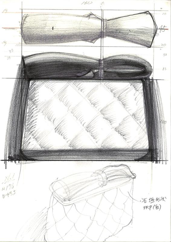 同じく日本史展で発表した「髷貯金箱」のスケッチです(画像3)。原寸のラインドローイングを検討した直後に描いた、1/10スケールの最終スケッチです。このスケッチは大まかな寸法取りをしたり、ディテールイメージをつかむためのものです。日本史展のディレクターである岡田栄造氏へのプレゼンも、このスケッチで行いました。