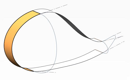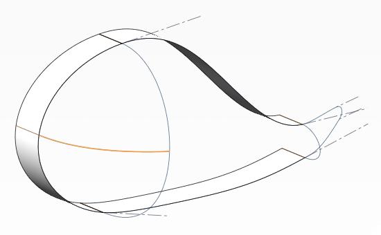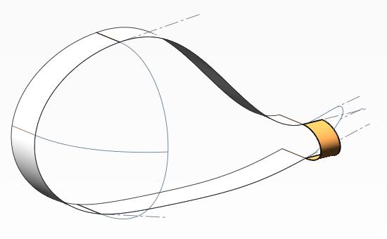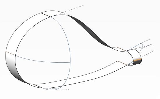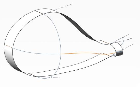 11.できたロフト曲面と頭部サポート曲面の間にフィルサーフェスを作成する。その際7で作成した曲線を通るように指定する(クリックで拡大)