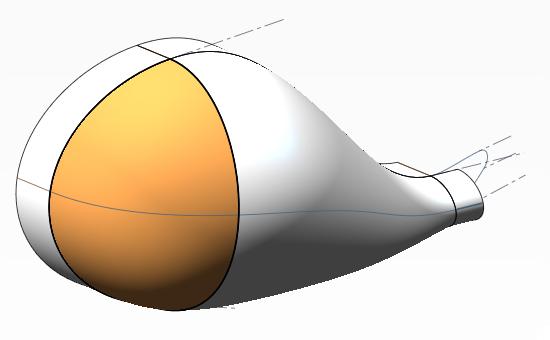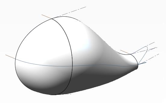 6-1.この状態でも胴体にロフト曲面が作成できるが、中間部もコントロールするための曲線を作成していく。まず頭部側にサポートとなる押し出し曲面を作成して、任意の位置に交線を作成しておく(クリックで拡大)