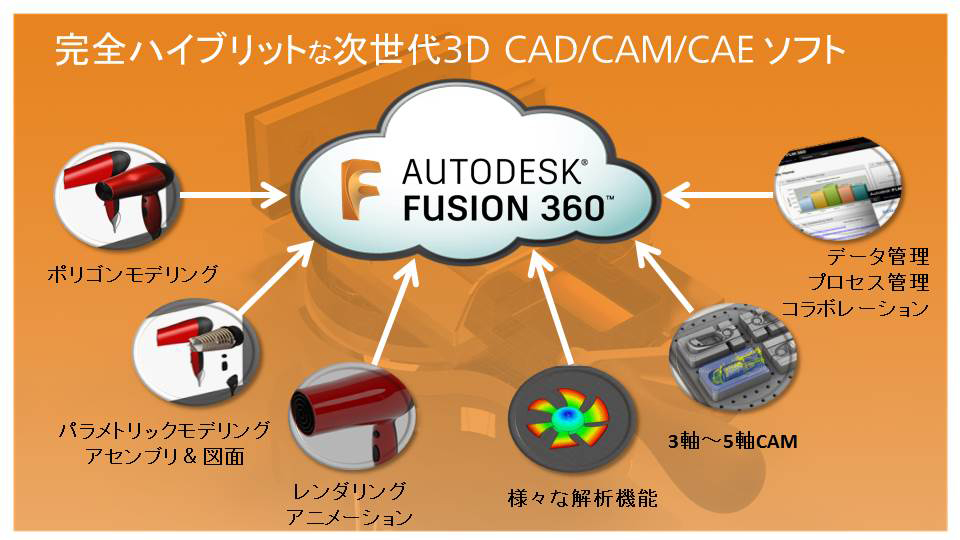 AutodeskR Fusion 360は、今までにない、製品開発のための3D CAD、CAM、CAE統合 ツールです。1 つのパッケージに工業設計と機械設計、コラボレーション、機械加工のツールが集約されています。またセキュアで統合された、クラウドプラットフォームを介して、製品開発に必要な全てのプロセスを、繋ぐことができます。Mac と Windows の両方でご利用可能です。
